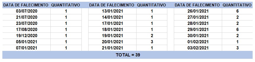 O boletim epidemiológico de hoje contabiliza 39 óbitos que ocorreram em diversas datas, conforme tabela abaixo.
