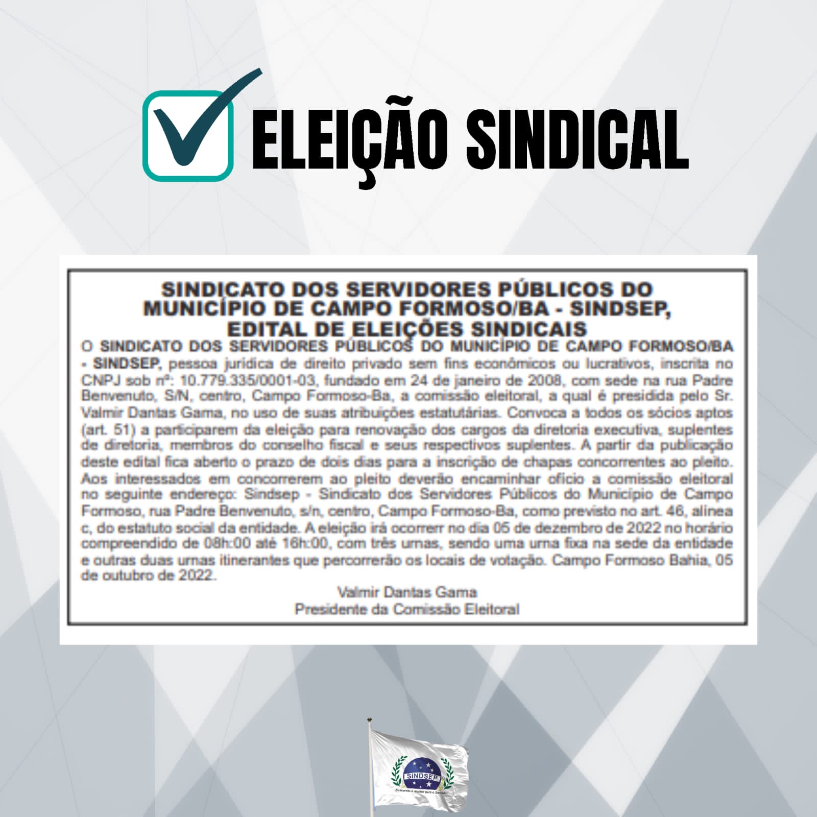 Foi publicado na edição desta quarta-feira, dia 05.10.2022, no Jornal Correio da Bahia, o Edital de convocação para o conhecimento e registro das chapas para eleição da Diretoria e do Conselho Fiscal do SINDSEP. O documento estará fixado no mural da entidade, bem como será compartilhado na lista de transmissão do whatsapp e nas redes sociais desta entidade sindical, para conhecimento e ampla publicidade, garantindo a lisura do processo.